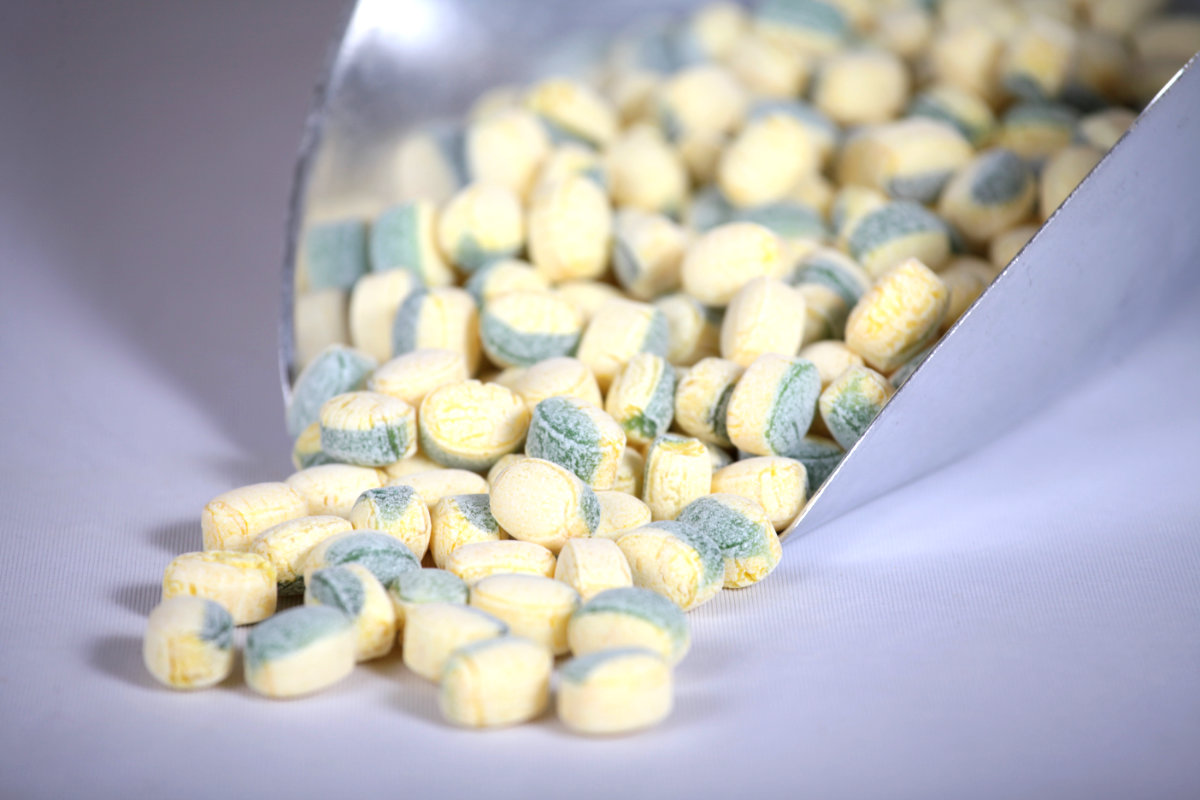 Ein gelb-grünes Bonbon mit Vanille und Apfel Geschmack